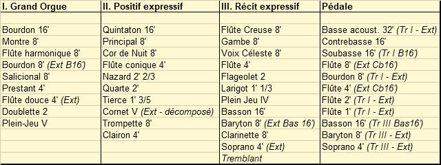 Accouplements : II/I (16,8,4') - III/I (16,8,4') - III/II (16,8,4') - II/II 4' - III/III 4'